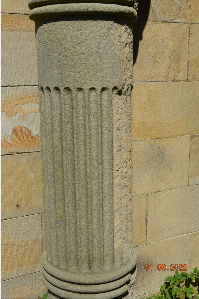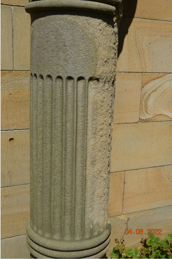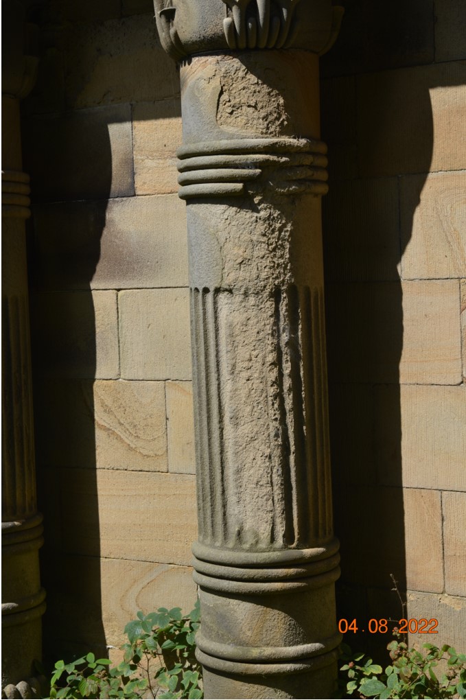 The mausoleum is suffering from notable degradation of the external sandstone columns which compromise’s its austere Egyptian form. This is particularly pronounced with the fluting to the middle columns which have weathered to such a point that this detailing, on an otherwise very simple design, is almost lost. The Trust awaits details of a full survey to identify the full scope of repairs required.