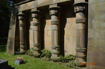 A rectangular mausoleum, built in red sandstone with stepped stone gables to either end. Designed in the Egyptian style, its most unusual feature is the row of stumpy columns recessed in the wall facing the church. These have bell capitals with papyrus leaves combined with contrasting concave and convex carved decoration. Inside the mausoleum, the wall opposite the entrance is lined from floor to ceiling with coffin niches, many of them empty.